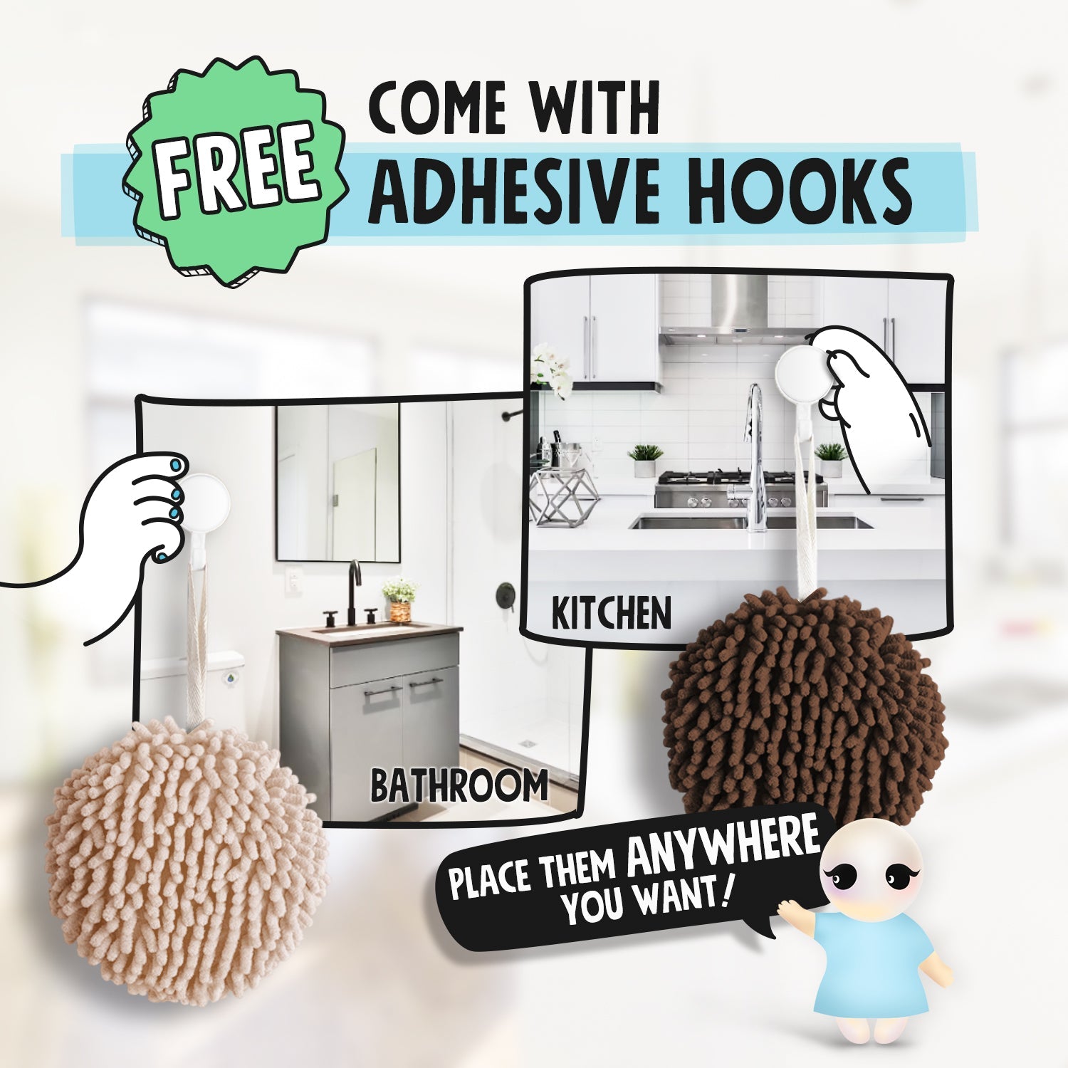 • VALUE SET: 6 TOWELS + 6 FREE HOOKS – this set includes 6 fuzzy ball towels (as pictured), plus 6 self-adhesive hooks for quick and easy hanging anywhere in your home.