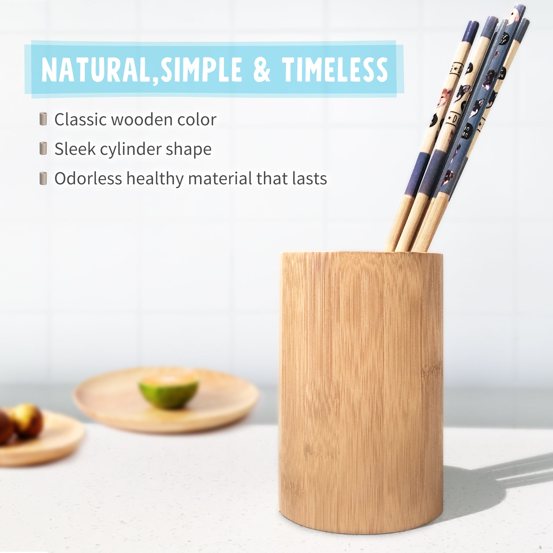 - NATURAL, SIMPLE & TIMELESS - featuring a classic wooden color and a sleek cylinder shape design, this bamboo pen holder/makeup brush organizer/silverware caddy will go with any home style easily and never out of style; measures 3'5'' in diameter and 5'5'' in height