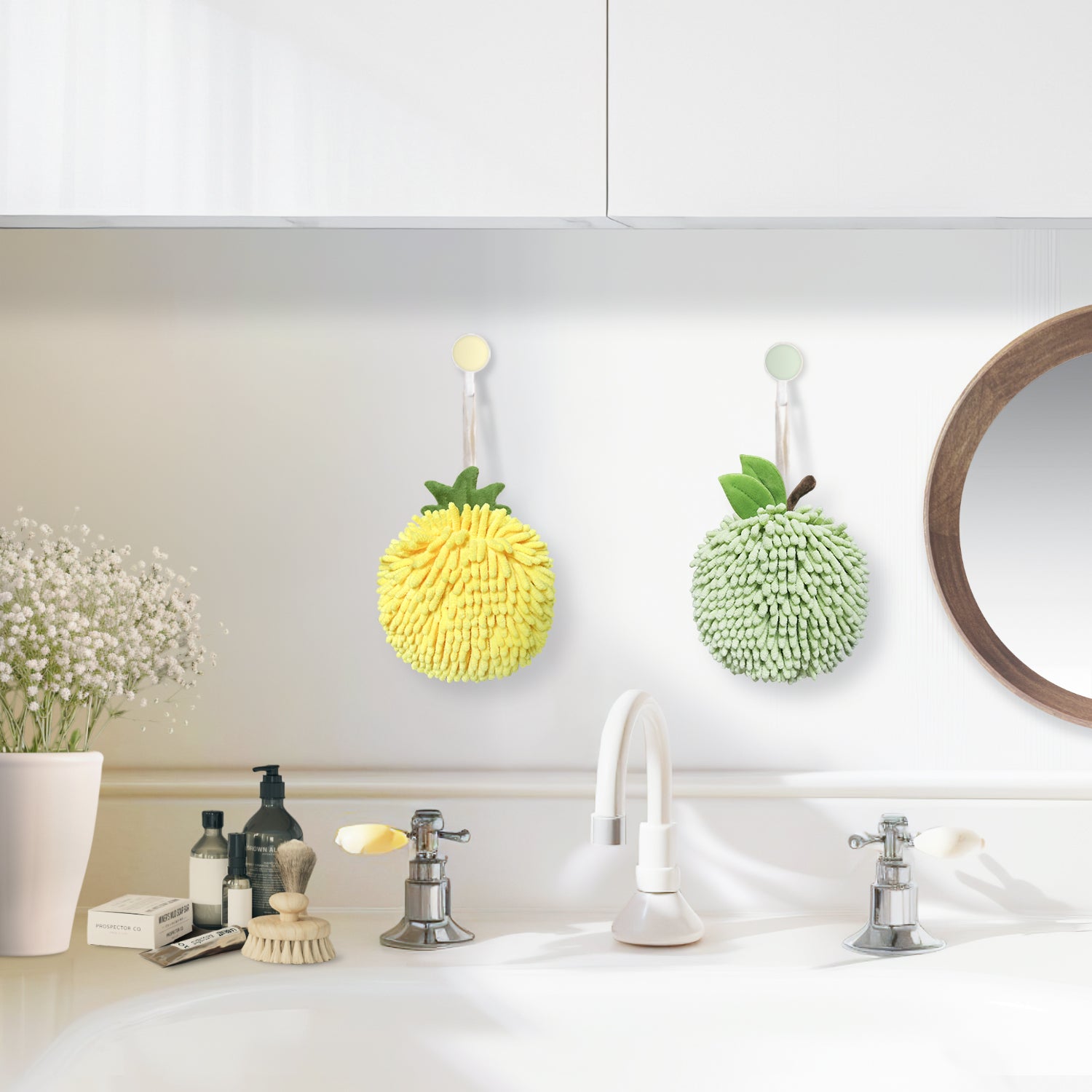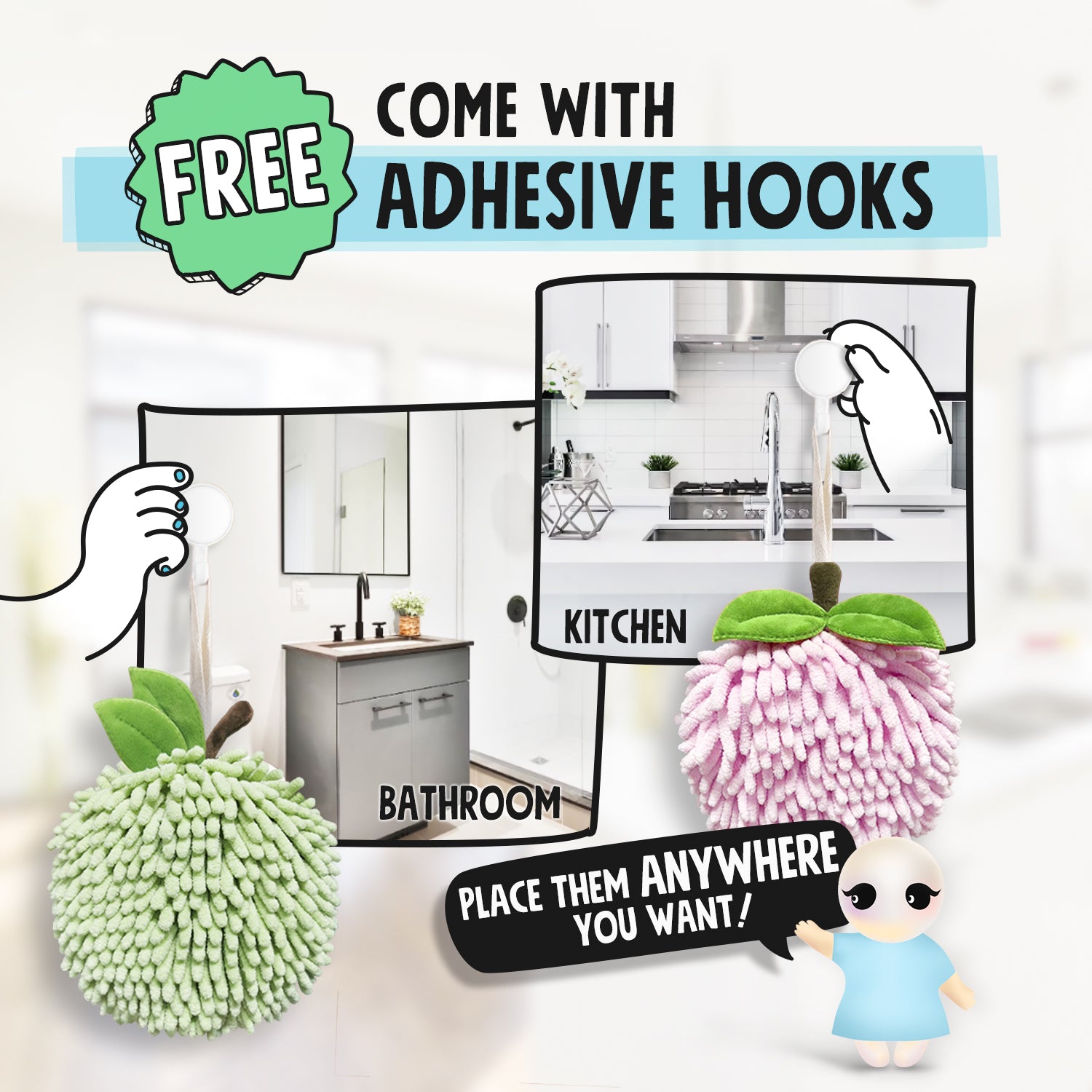 • VALUE PACK: 2 TOWELS + 2 FREE HOOKS – this set includes 2 fruity fuzzy ball towels (as pictured), plus 2 self-adhesive hooks for quick and easy hanging anywhere in your home.