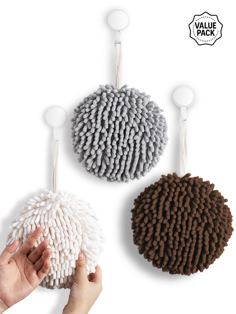 • VALUE PACK: 3 TOWELS + 3 FREE HOOKS – this set includes 3 fuzzy ball towels (as pictured), plus 3 self-adhesive hooks for quick and easy hanging anywhere in your home.